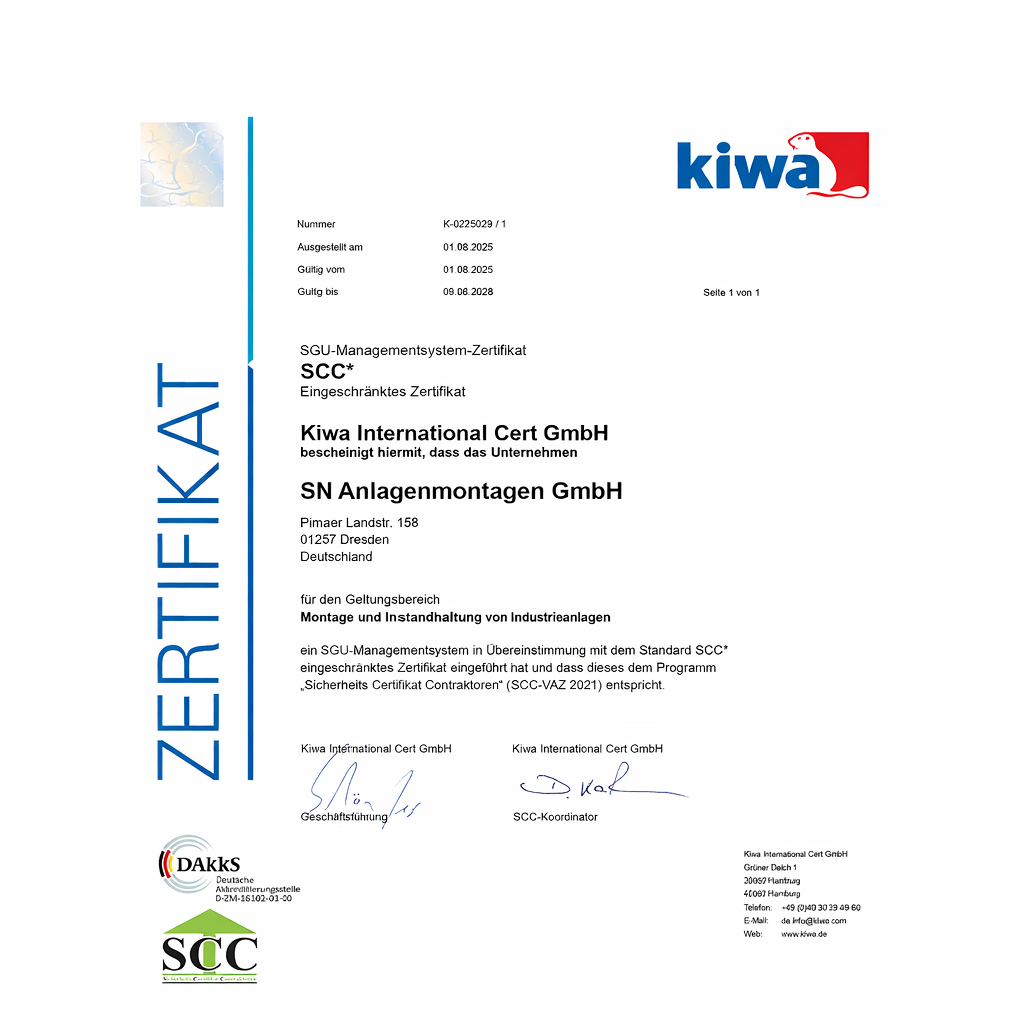 sämtlicher Montage-, & Demontage Vorhaben. Wir sind zertifiziert durch Kiwa International Cert GmbH SGU - SCC* -VAZ 2021.